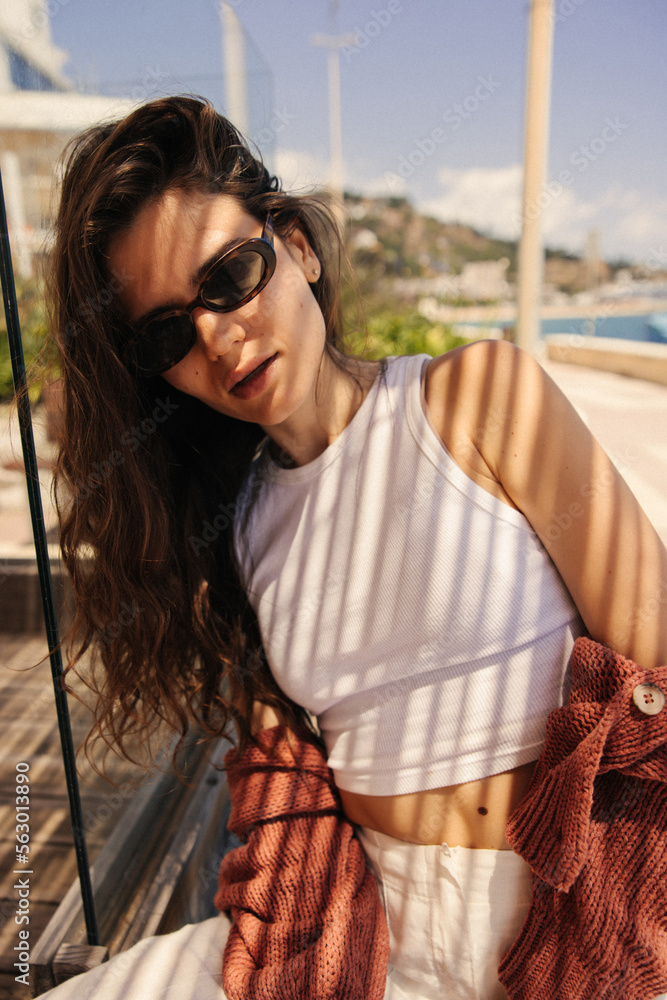 Nice young caucasian girl in stylish sunglasses looks at camera with beach background. Brunette wears white shirt and brown cardigan. Calm and peaceful concept.
