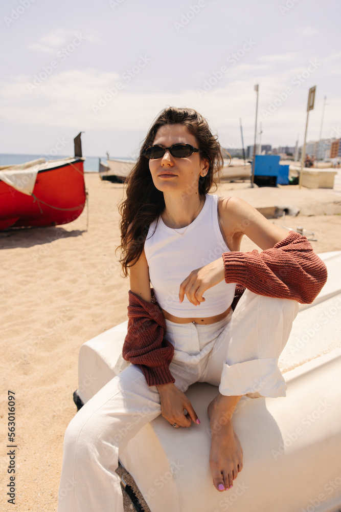 Calm young caucasian girl in fashionable sunglasses spends free time on beach in sunny weather. Brunette wears white shirt, cardigan and light casual jeans. Concept lifestyle.