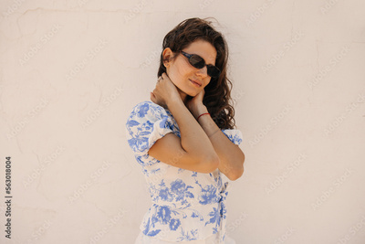 Beautiful young caucasian woman in sunglasses posing against light wall outdoor. Brunette wears white shirt. Concept tenderness, good mood.