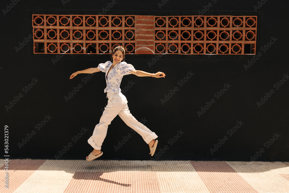 In full growth funny young caucasian woman walks hopping down street with wide smile. Brunette wears light casual clothes. Concept positive moments, enjoying life.