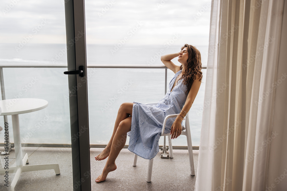 Nice young caucasian girl dressed in striped cocktail dress sitting on chair hotel balcony. Brunette hair woman spends time outdoors. Concept relaxing time.