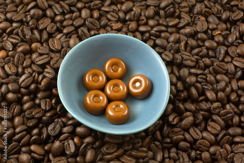 Coffee hard candy in small blue dessert bowl and roasted coffee beans