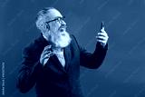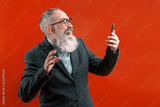Angry senior man screaming holding a smartphone. Weird with a gray beard in a light shirt in a dark casual jacket on a bright red background