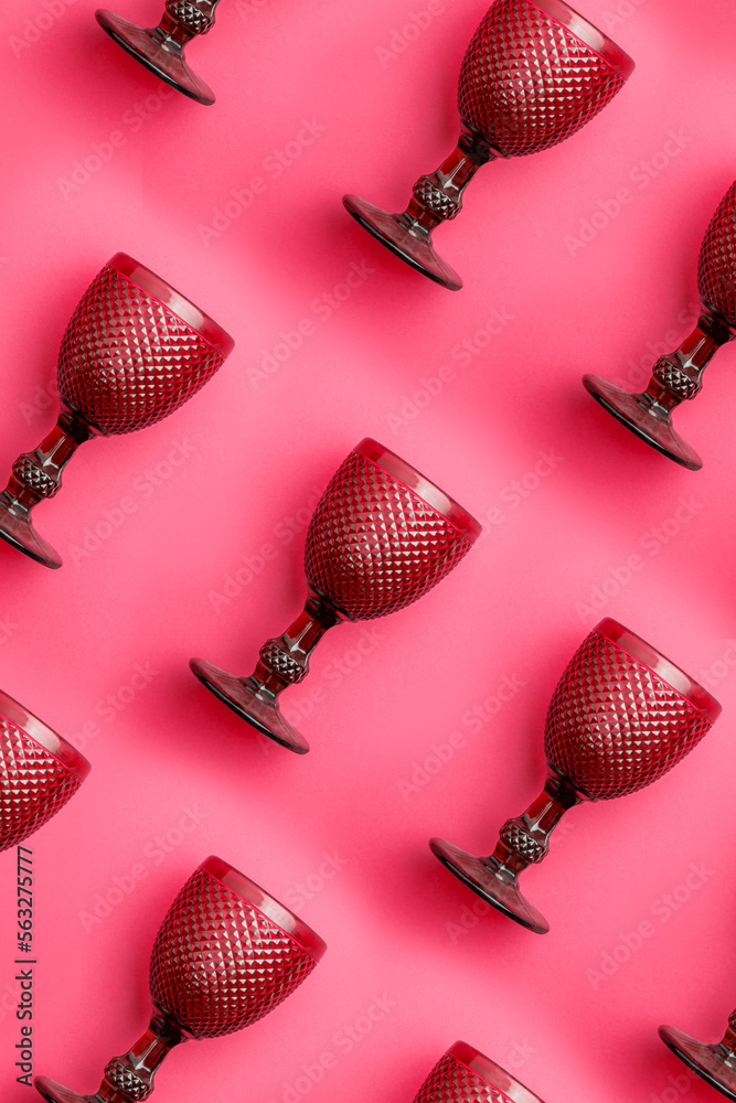 Colored glass goblet. Abstract background with empty wine glass flat lay. Concept of holiday background