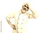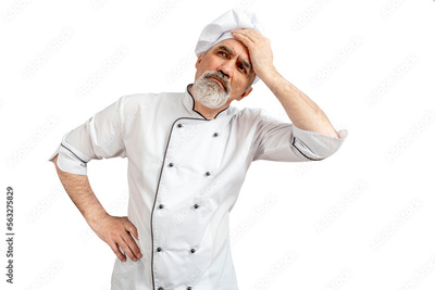 Chef-cooker in a chef's hat and jacket clutched his head. Senior disappointing baker man wearing a chef's outfit. Character kitchener, pastry chef for advertising