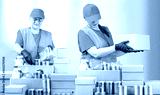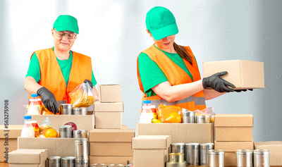Help Collection Center, free food distribution. Volunteers wearing uniform green caps, t-shirts, orange vests prepare a food package grocery set for in-need people, sort, collect food donation boxes