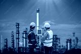 Engineer wearing uniform helmet standing hand holding detail tablet inspection work plant site progress with plantation oil refinery industrial background.