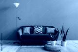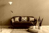 Interior of living room with brown sofa, lamp and houseplants near green wall