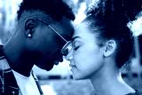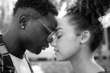 Young African American loving couple tenderly touching foreheads, sharing a romantic, intimate, affectionate moment.