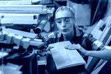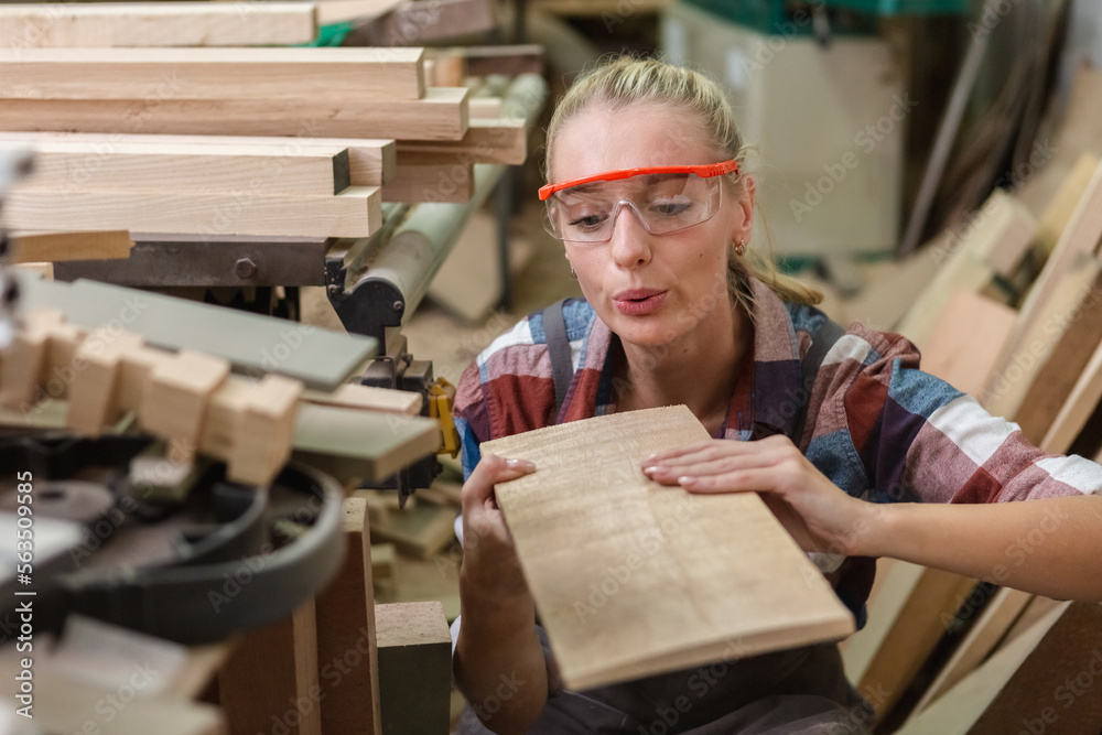 young carpenter woman wear uniform and goggles choose the size and quality wood used for work. craftsman professional concept. woodworking industry.