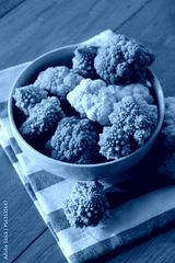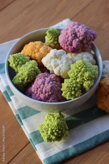 Various sort of cauliflower in a bowl on wooden table. Purple, yellow, white and green color cabbages and green Romanesco or Roman cabbage
