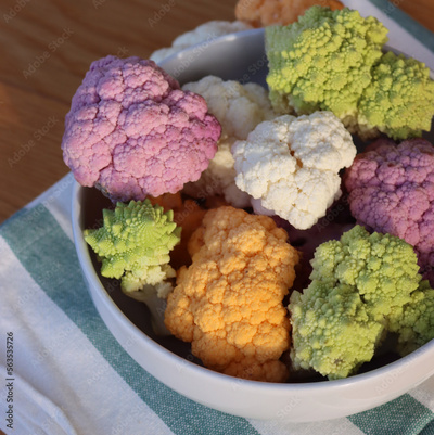 Various sort of cauliflower in a bowl on wooden table. Purple, yellow, white and green color cabbages and green Romanesco or Roman cabbage