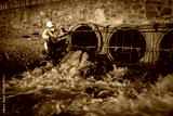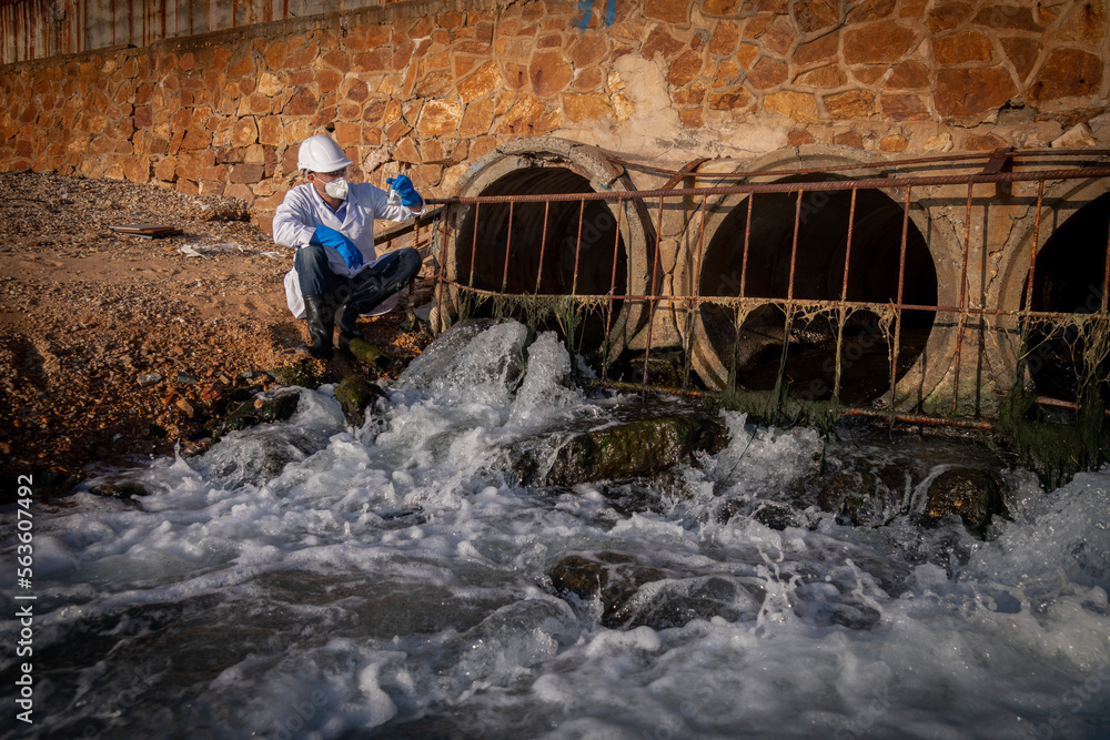 Worker under checking the waste water treatment pond industry large to control water support industry