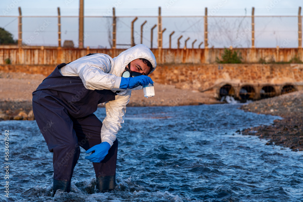 Worker under checking the waste water treatment pond industry large to control water support industry