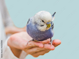 Bright, cute parrot and a young woman holding food on her hand. Close-up, indoors. Studio photo. Day light. Concept of care, education and raising pets