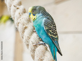Bright, cute parrot sitting on a rope against the background of a white, wooden wall. Close-up, indoors. Studio photo. Day light. Concept of care, education and raising pets