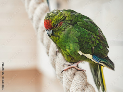 Bright, cute parrot sitting on a rope against the background of a white, wooden wall. Close-up, indoors. Studio photo. Day light. Concept of care, education and raising pets