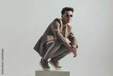 cool fashion model with plaid pants and beige jacket crouching on white box