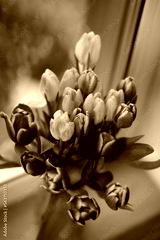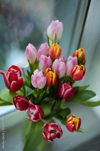 beautiful, colorful tulips in a vase, stand by the window, spring mood