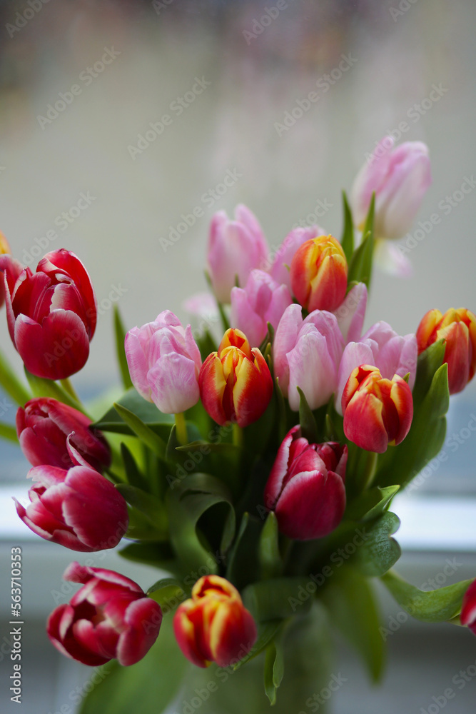 beautiful, colorful tulips in a vase, stand by the window, spring mood