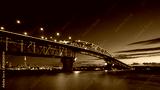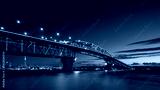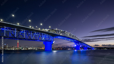 Auckland Harbour Bridge glowing in blue. Skytower in gold and red. Auckland, New Zealand
