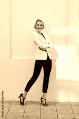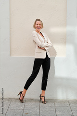 Stylish woman looking at camera and smiling while standing outdoors on the street.