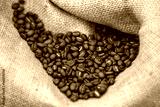 Roasted brown coffee beans or seeds in a jute sack, close up