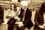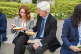 Business people doing lunch break outdoor from office building - Main focus on senior man ear