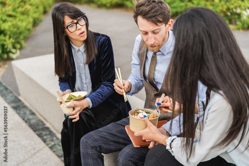 Business people doing lunch break outdoor from office building - Focus on center man face