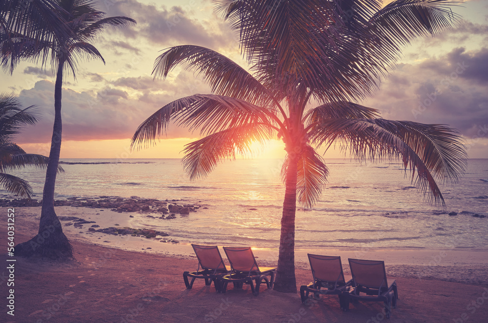 Tropical beach with coconut palm trees at sunset, color toned picture.