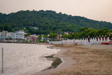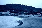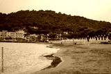 Sun loungers and umbrellas on the beach in Scauri, Italy.
