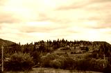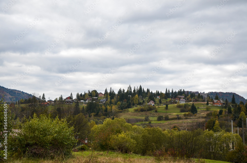 Autumn landscape with rural houses on the slopes surrounded trees and meadows in the mountain village Slavske, Carpathian Mountains, Ukraine