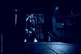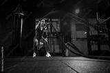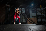 young sports girl in red sportswear trains with ropes in a black dark gym, motivated woman on fitness training