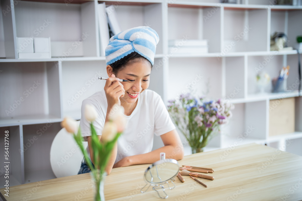 Attractive asian woman doing make up in living room at morning..