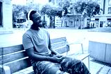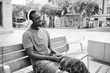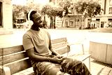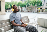 Man smiling while listening music with mobile phone and headphones sitting outdoors.