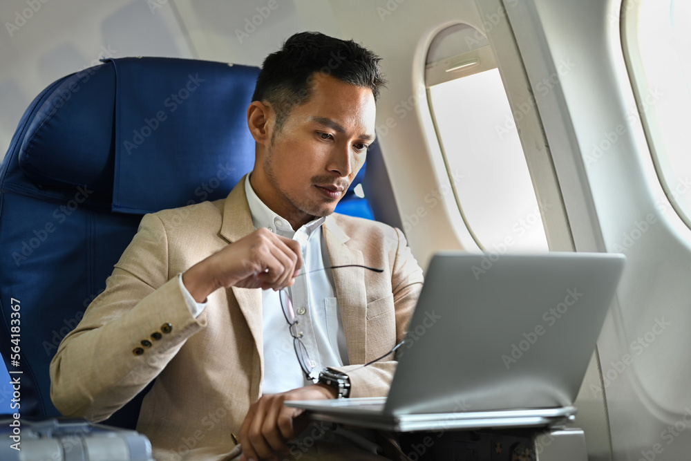 Serious man passengers holding eyeglasses and using laptop while sitting near window in an airplane