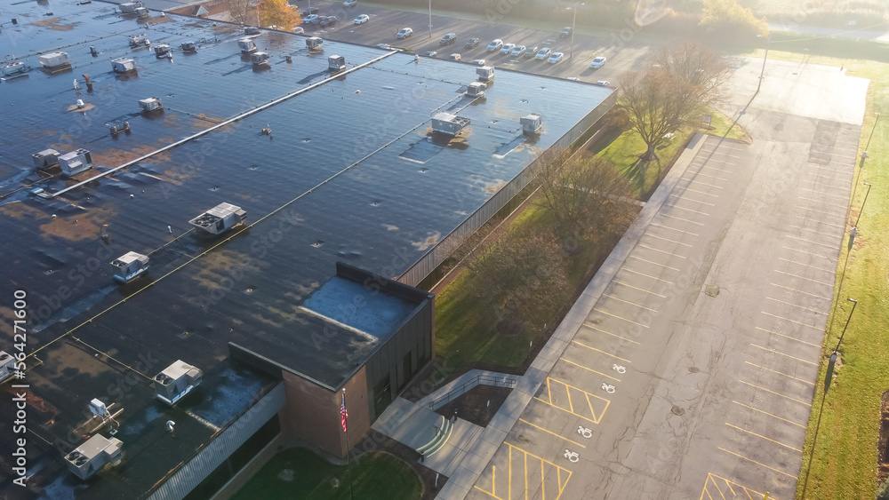 Proudly display of American flag at the entrance of large commercial building with rooftop units HVAC system provide heating, cooling, and ventilation in Pittsford, New York