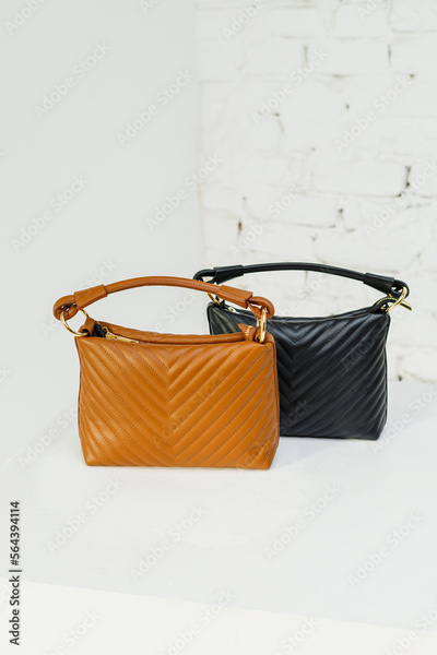 Brown and black women's casual bag made of eco-leather close-up. Women's leather bag
