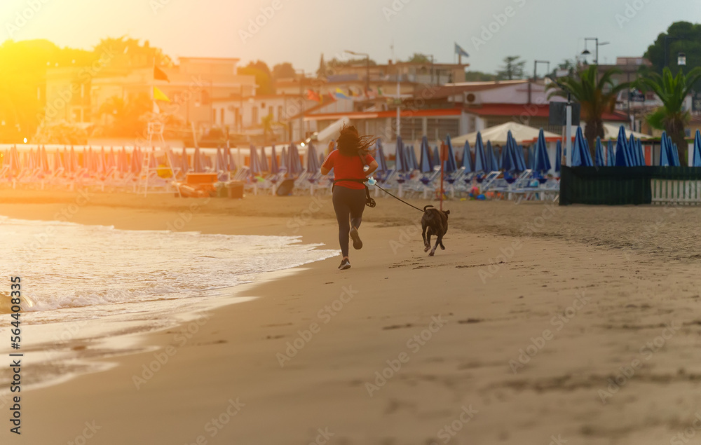 Woman runs with dog along the seashore.
