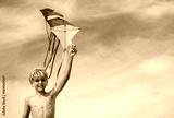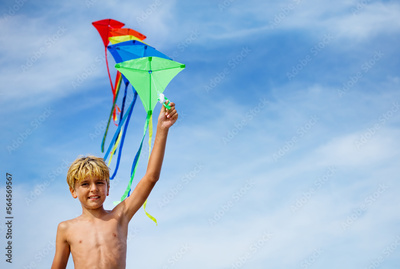 Close-up of a boy holding many kites in hand over blue sky