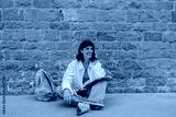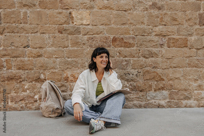 Caucasian smiling woman sitting on the floor with backpack and notebook. Wearing casual clothes, looking away, touching hair. Lifestyle concept