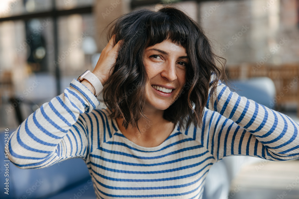 Image of happy european woman holding phone and looking at camera. Smiling young brunette sitting near to wall with backpack. Concept of positive emotion, technology