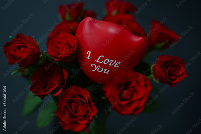 beautiful red roses, a red heart-shaped balloon, a bottle of champagne, the perfect preparation for Valentine's Day. The composition lies on a dark background.