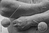 Macro-detailed circles psoriasis skin with different degrees of skin damage, wounds. Male arms with cracked, hard, horny, flaky skin. Dermatological problems of allergy, eczema. Hand stains, rash, dry