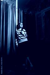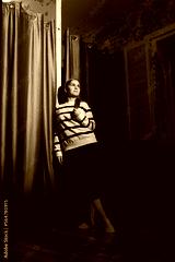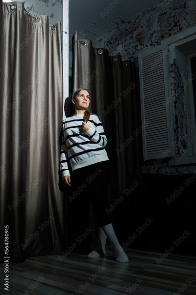 Cute stylish young woman in black leggings and striped jumper sitting on sofa. Women's fashion, women's casual style.