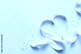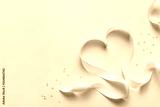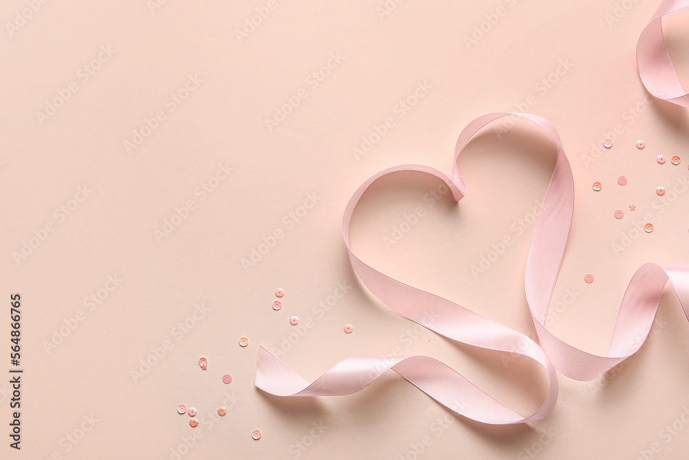 Pink ribbon with hearts on beige background. Valentine's Day celebration
