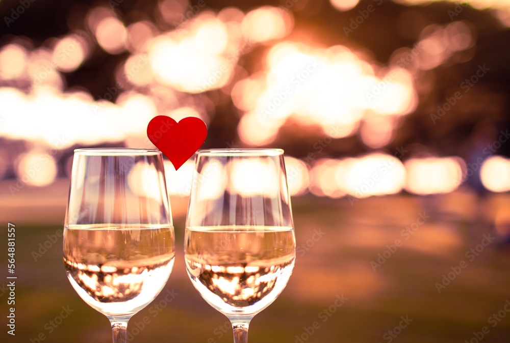 Two glasses of wine and heart. Romantic Valentine's date dinner concept.