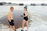 Winter swimming. Young couple ready to swim in ice water. Tea after plunge in cold water. Man and woman wrapped in a towel and swimming clothes. Hat and gloves. People and nature lake in the city