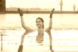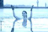 Winter swimming. Woman in frozen lake ice hole. Swimmers wellness in icy water. How to swim in cold water. Beautiful young female in zen meditation. Gray hat and gloves swimming clothes. Nature lake