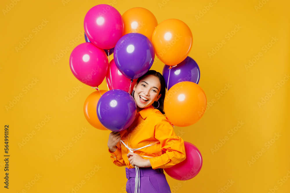 Happy fun young cheerful joyful cool woman wearing casual clothes celebrating hold bunch of colorful air balloons look camera isolated on plain yellow background. Birthday 8 14 holiday party concept.